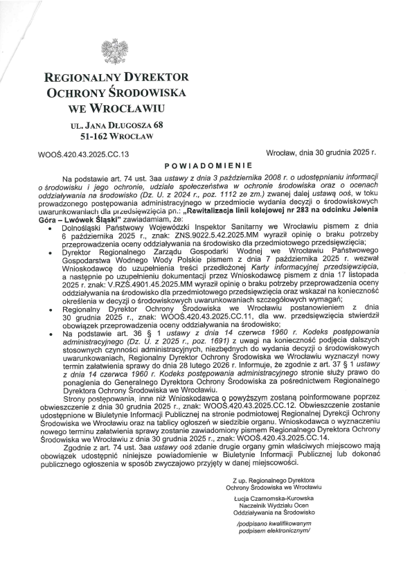 Decyzja o środowiskowych uwarunkowaniach dla przedsięwzięcia – Rewitalizacja lini kolejowej nr 283 na odcinku Jelenia Góra - Lwówek Śląski